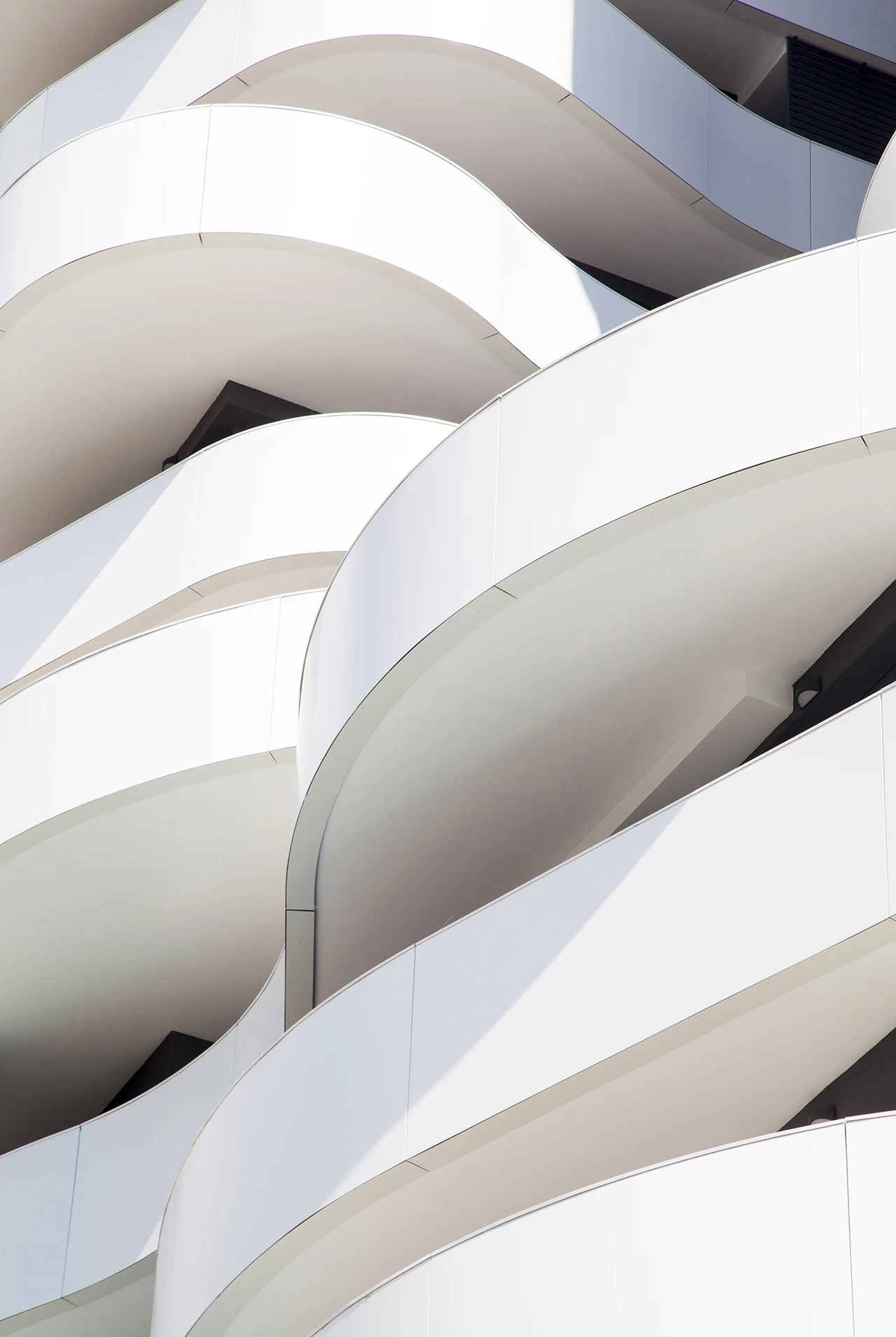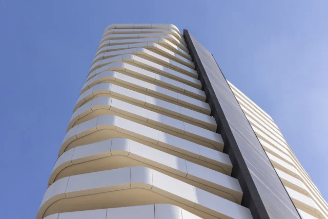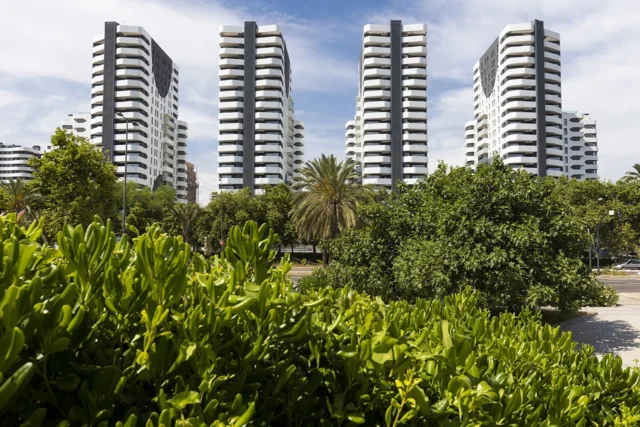 Imagen de la fachada de un edificio de viviendas con varias ventanas de diferentes tamaños y formas con los marcos pintados de diferentes colores